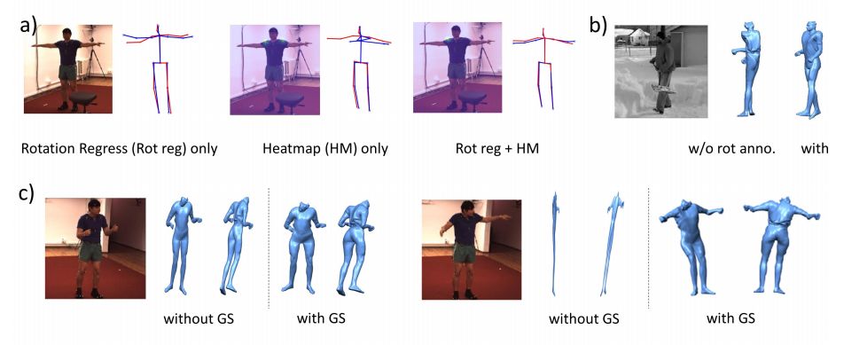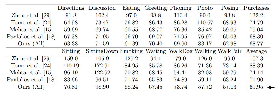 实验在重建误差、旋转和MPJPE(每关节平均位置误差)上到得到了较好的结果。相较于今年cvpr的87.97mm的结果,这篇文章的MPJPE达到了69.9mm。