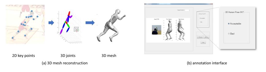 为了对网络进行充分的训练,研究人员对MPII数据进行了3D标注,利用PMP(projected matching pursuit)等方法得到了原数据集中关节的三维位置,并利用标注工具标注了3D位姿。最终得到了10291张标记图像。