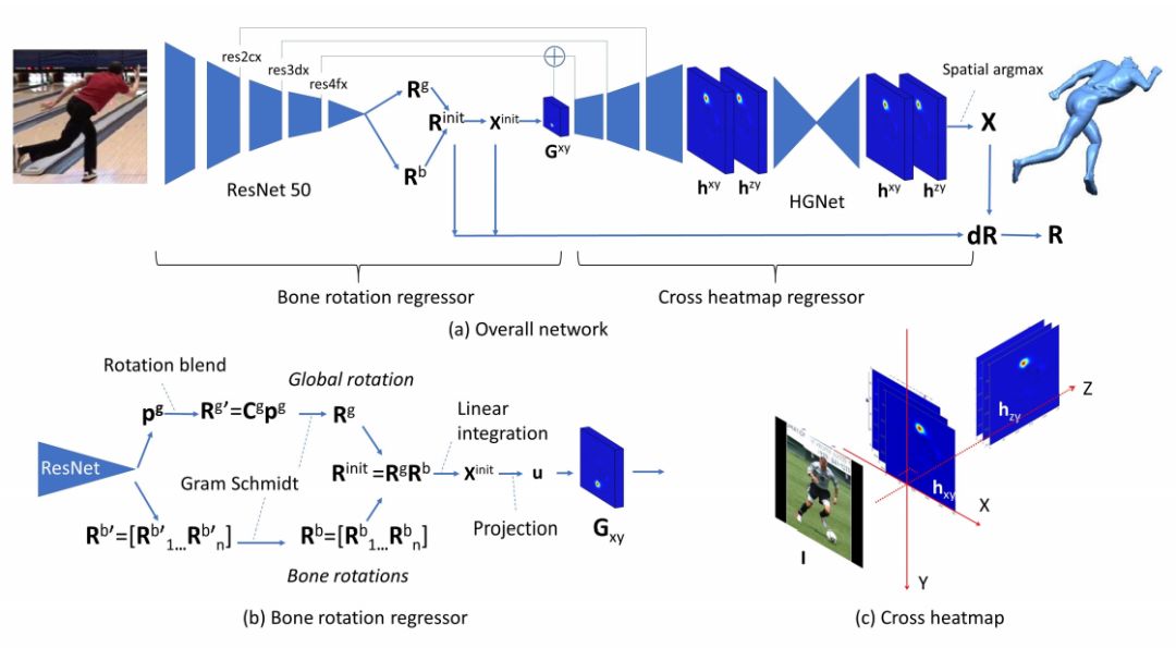 在这一工作中,研究人员提出了SkeletonNet模型,通过结合骨骼结构和关节3D位置的热力图表示实现了3D人体关节位姿的高精度估计。这一模型主要由负责从输入图像获得初始解的骨旋转网络,基于此利用卷积热力图回归器来恢复出更为精确的结果。模型的架构如下图所示: