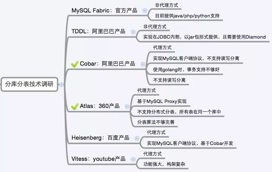 目前市面上的分库分表中间件相对较多,其中基于代理方式的有MySQL Proxy和Amoeba, 基于Hibernate框架的是Hibernate Shards,基于jdbc的有当当sharding-jdbc, 基于mybatis的类似maven插件式的有蘑菇街的蘑菇街TSharding, 通过重写spring的ibatis template类的Cobar Client。